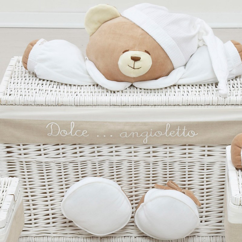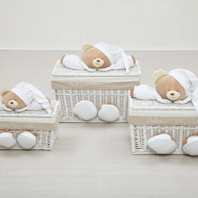Il Baule Nanàn medio della collezione Tato è in vimini intrecciato a mano e laccato con vernice bianca a base di acqua nel rispetto delle norme europee.