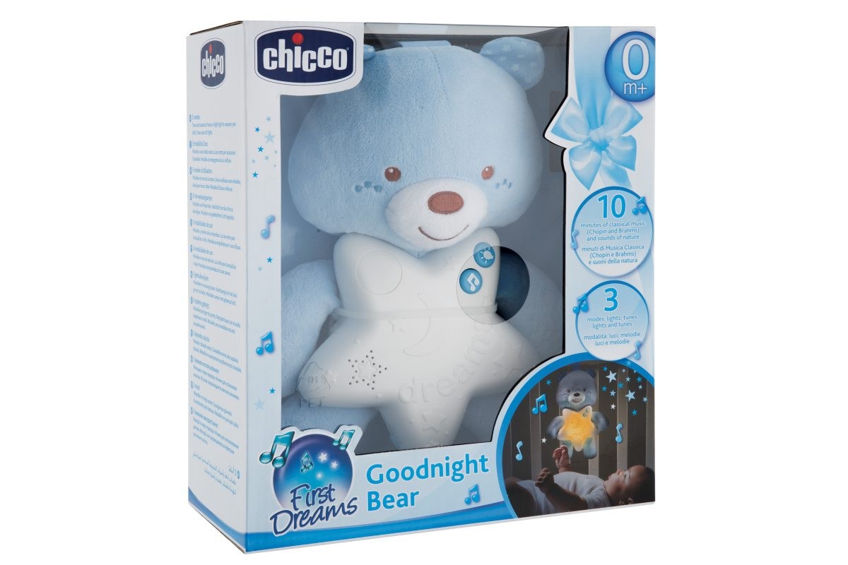Chicco realizza l’orsetto Goodnight Bear luci e suoni con caratteristiche studiate per favorire al meglio la nanna dei bambini.