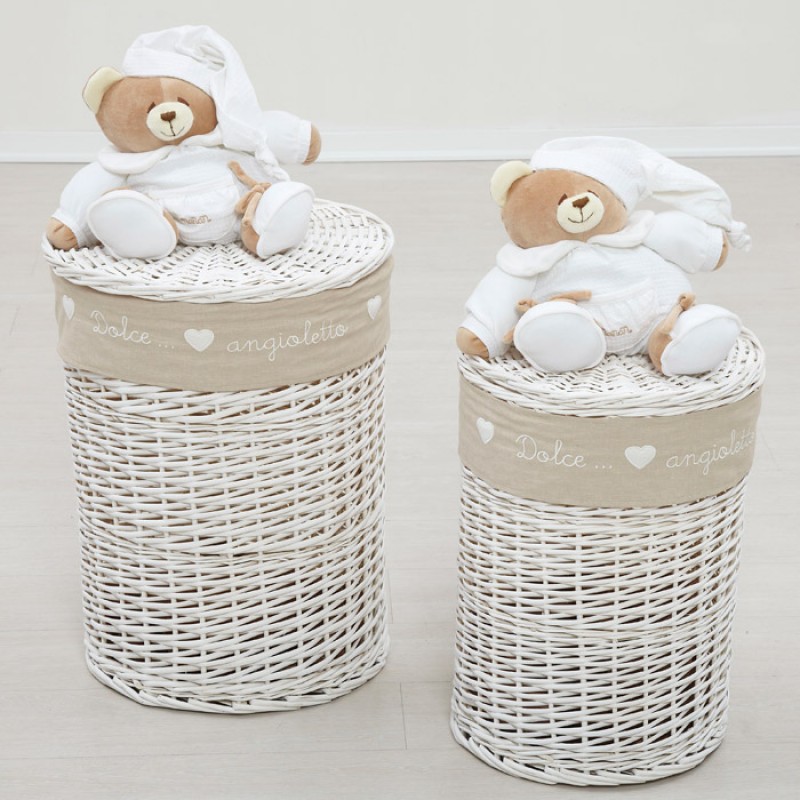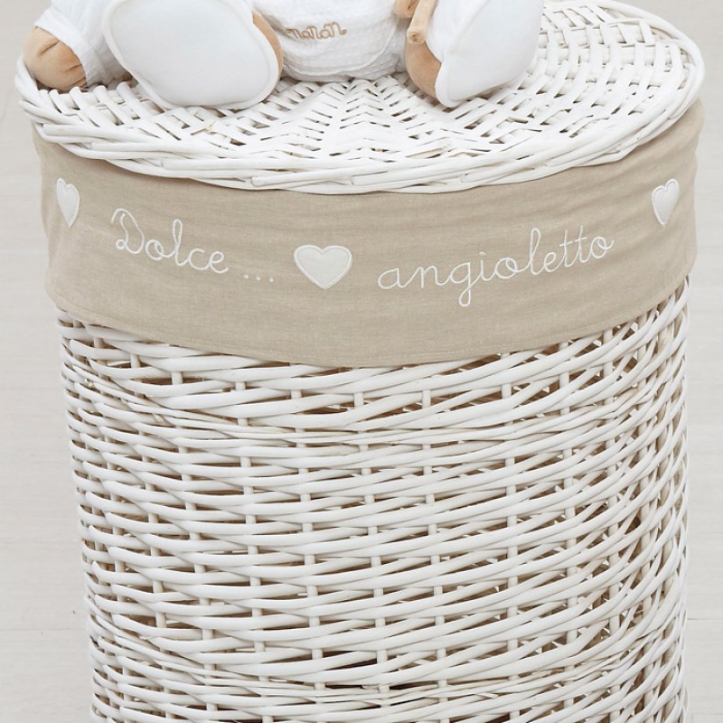 Il cesto portagiochi Nanàn della collezione Tato è in vimini intrecciato a mano e laccato con vernice bianca a base di acqua, nel rispetto delle norme europee.