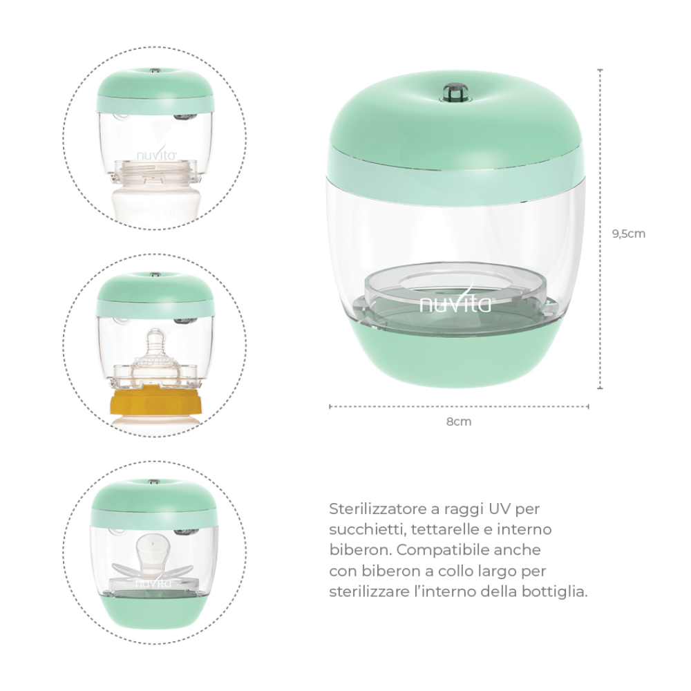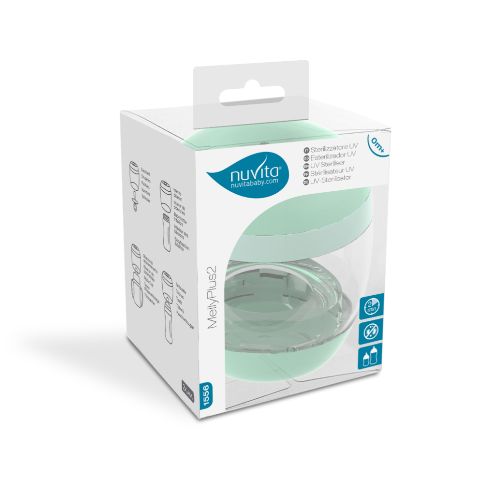 Lo sterilizzatore a raggi UV MellyPlus2 sterilizza in modo pratico e veloce tutti i modelli di succhietti, tettarelle e biberon.