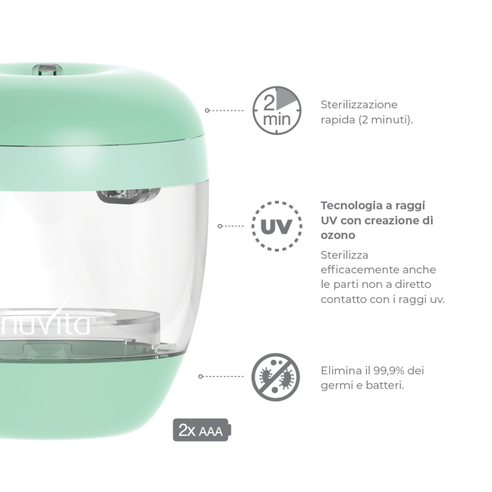 – Adatto per succhietti, tettarelle (anche senza rimuoverle dal biberon) e biberon