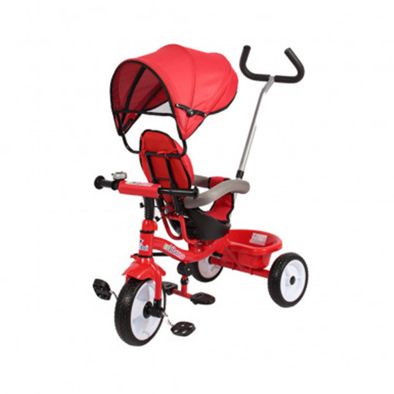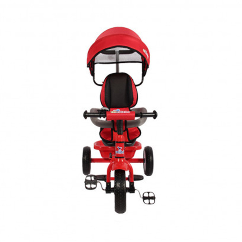 Sulla parte alta della cappottina è fissato un secondo manubrio per consentire ai genitori di manovrare il triciclo.