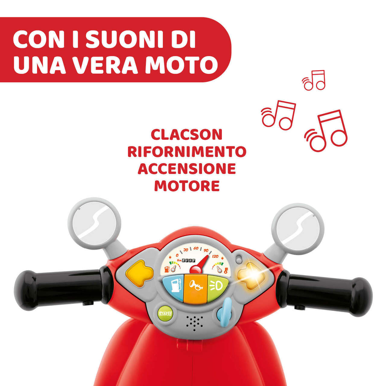 Il gioco cavalcabile Chicco dallo stile inconfondibile; il design originale Vespa Primavera farà vivere al bambino avventure emozionanti e momenti divertenti in piena libertà.