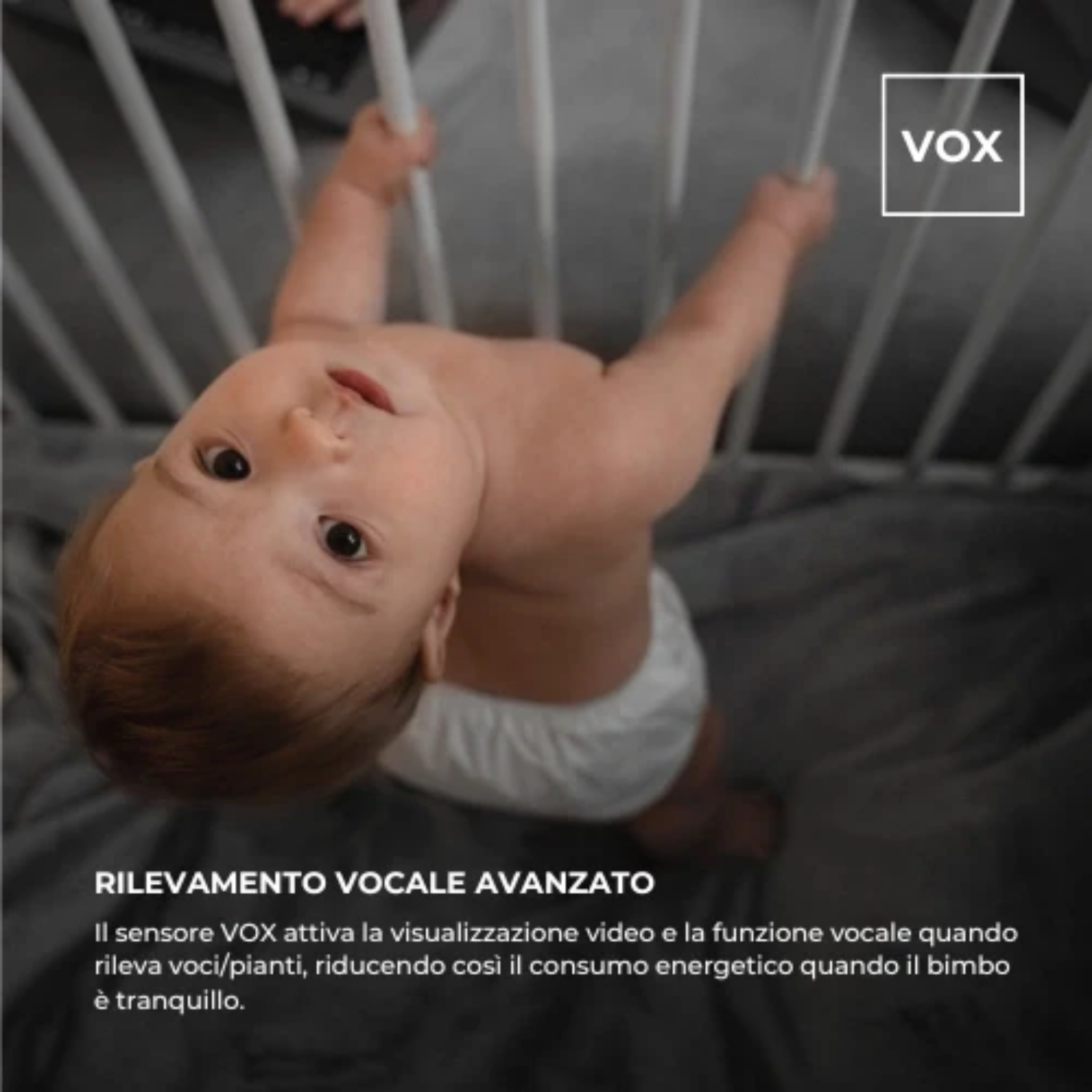 Il video monitor per neonati è dotato di un sensore VOX in grado di rilevare la voce o il pianto del bambino ed attiva automaticamente la visualizzazione video e la funzione vocale per una risposta immediata. Grazie alla funzione SMARTVOX, che attiva il video solo al rilevamento del suono (pianto o voce del bambino), si riduce il consumo energetico della batteria che può durare fino a 12 ore.